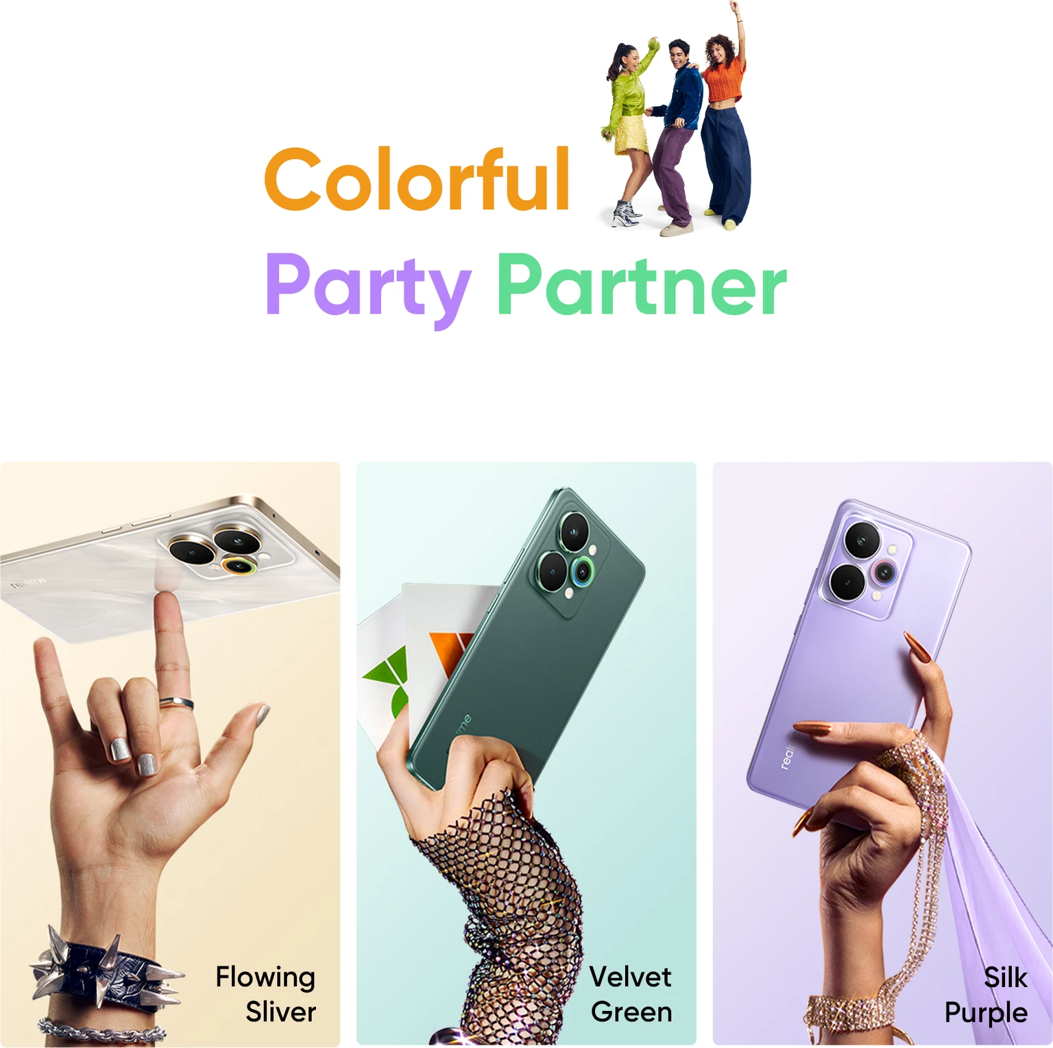 Flowing Silver, Silk Purple, Velvet Green